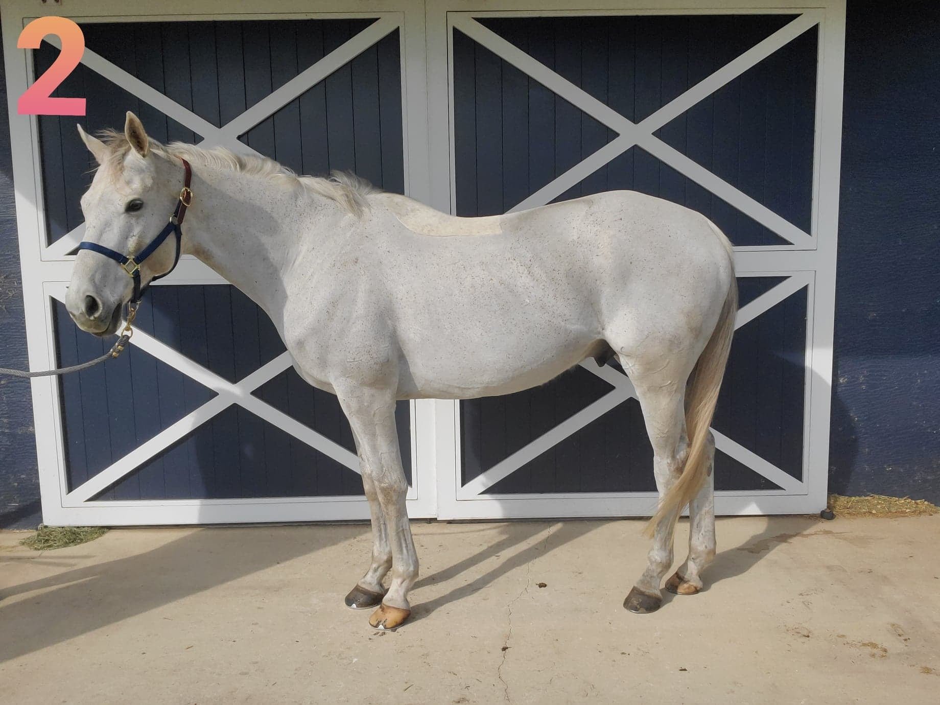 2 - BCS: 5.5 - Don't let his withers or thoroughbred rump fool you! He is in PERFECT condition for his discipline of 3 day eventing and he's running prelim this weekend. Good luck Chai and Tasha! Also, you may see what looks like ripples over the ribs in one spot. They're not actual rib ripples, small fat ripples just from how he's standing. He's not ribby at all. 🙂